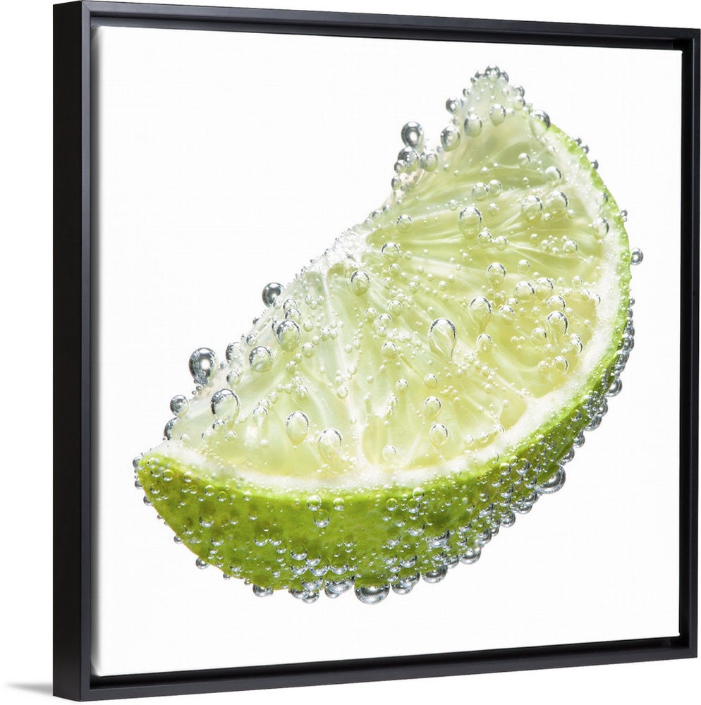 <p>A juicy ripe organic lime wedge fruit submerged in clean clear refreshing water and covered in bubbles on a white background in studio</p>