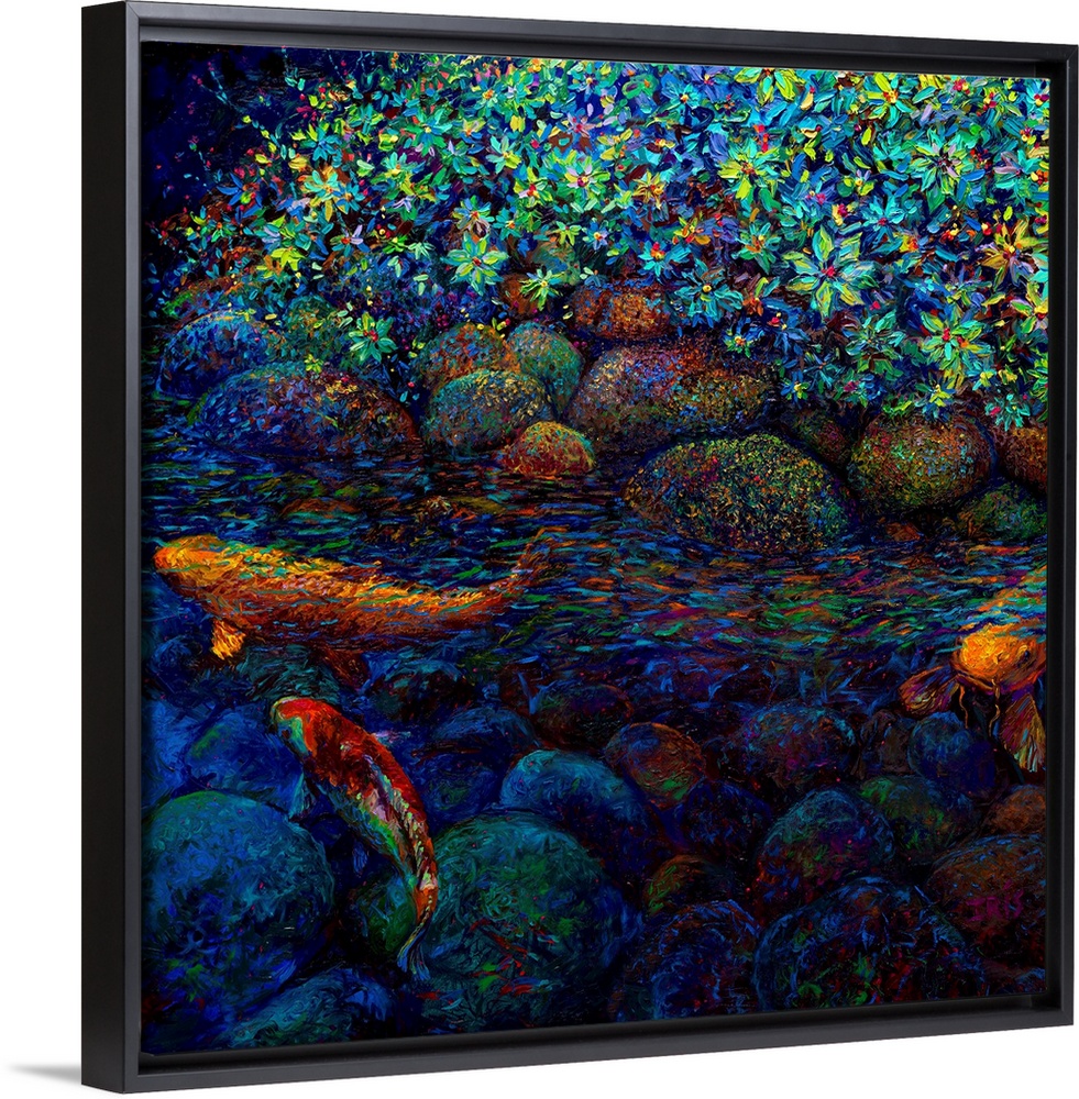 <p>Brightly colored contemporary artwork of a koi fish by flowers.</p>