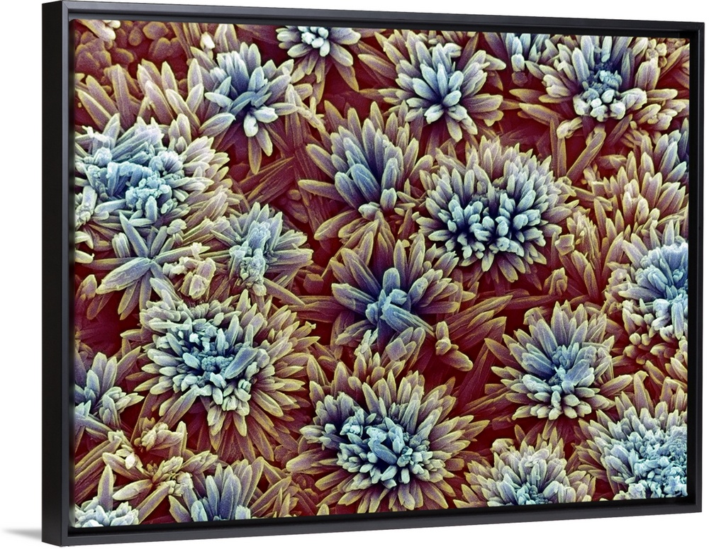 <p>Limescale. Coloured scanning electron micrograph (SEM) of limescale from a domestic kettle. Limescale, which occurs when hard water is boiled, consists of crystals of calcium carbonate and crystals of calcium sulphate (needles) that have precipitated out of the water. Magnification: x800 when printed 10 centimetres wide.</p>