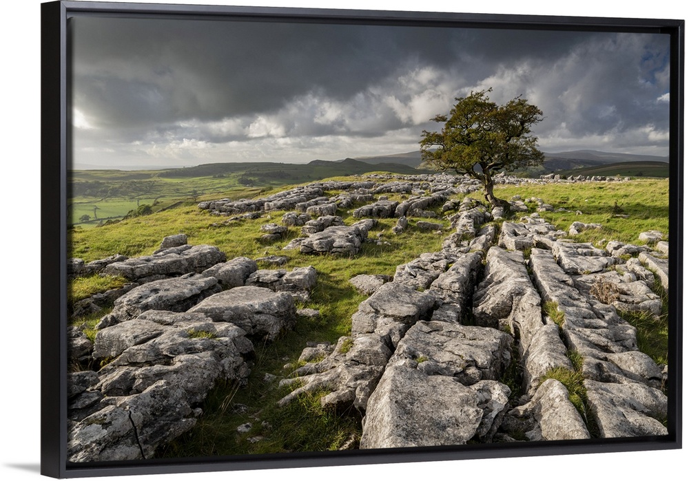 <p>Limestone pavement and lone hawthorn tree at Winskill Stones, Yorkshire Dales National Park, North Yorkshire, England. Autumn, October 2021.</p>