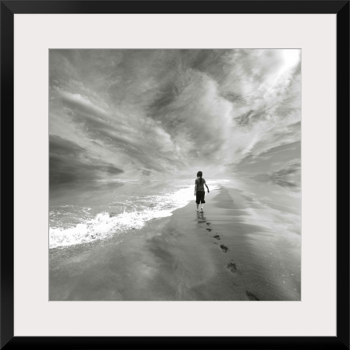 <p>A young child walks along the beach to the edge of the water, leaving a trail of footprints behind.</p>