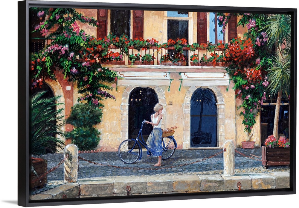 <p>Big oil painting on canvas of a woman riding a bike through an Italian street.</p>