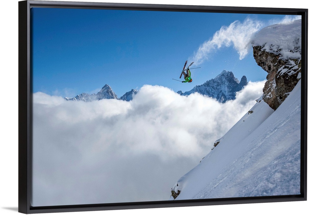 <p>A skier leaps off a mountain in France, kicking off snow from the ends of the skies.</p>