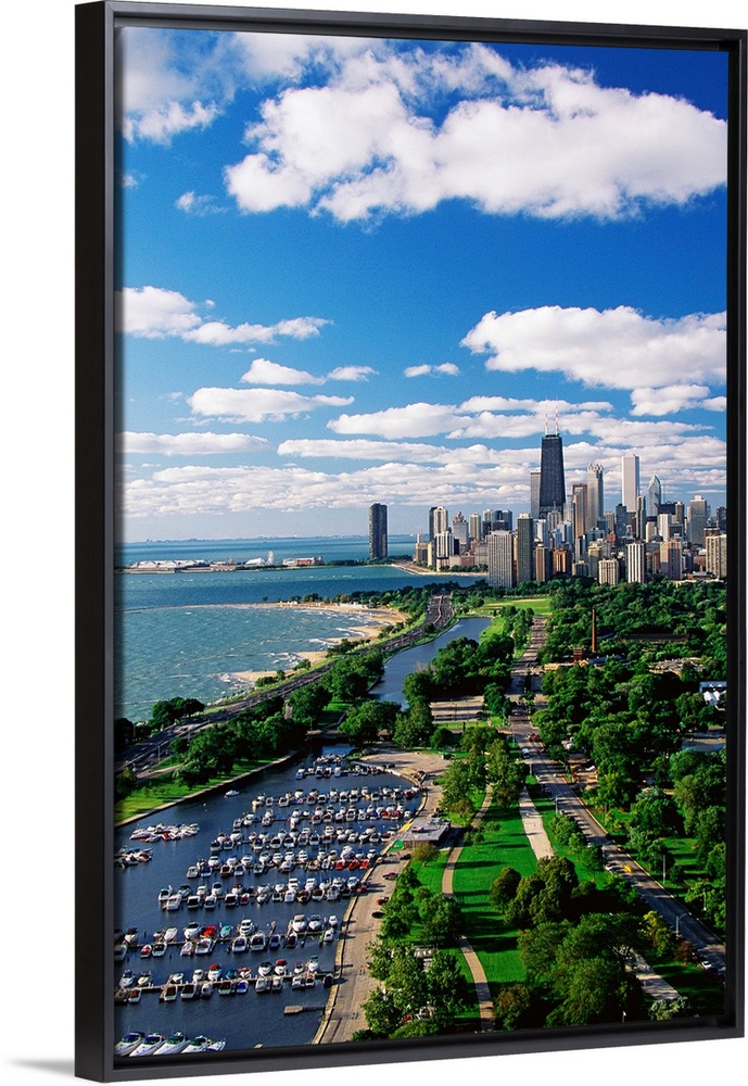 <p>A vertical cityscape photograph of the urban areas along Lake Michigan.</p>