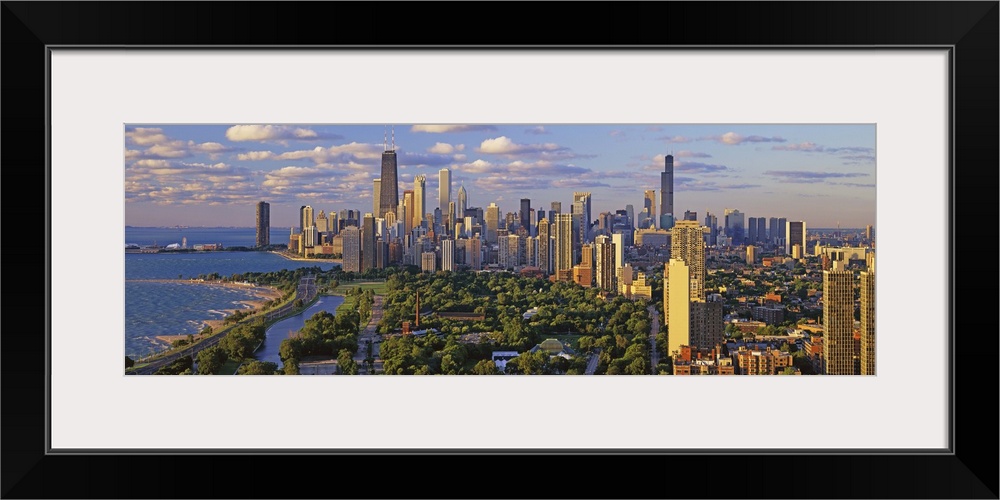 <p>This is Lincoln Park with Diversey Harbor in the foreground and Lake Michigan on the left looking south. It shows the skyline in morning light in the summer. The John Hancock Building is fairly prominent toward the left hand side.</p>