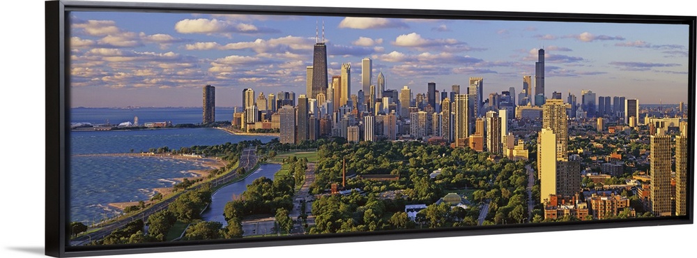 <p>This is Lincoln Park with Diversey Harbor in the foreground and Lake Michigan on the left looking south. It shows the skyline in morning light in the summer. The John Hancock Building is fairly prominent toward the left hand side.</p>