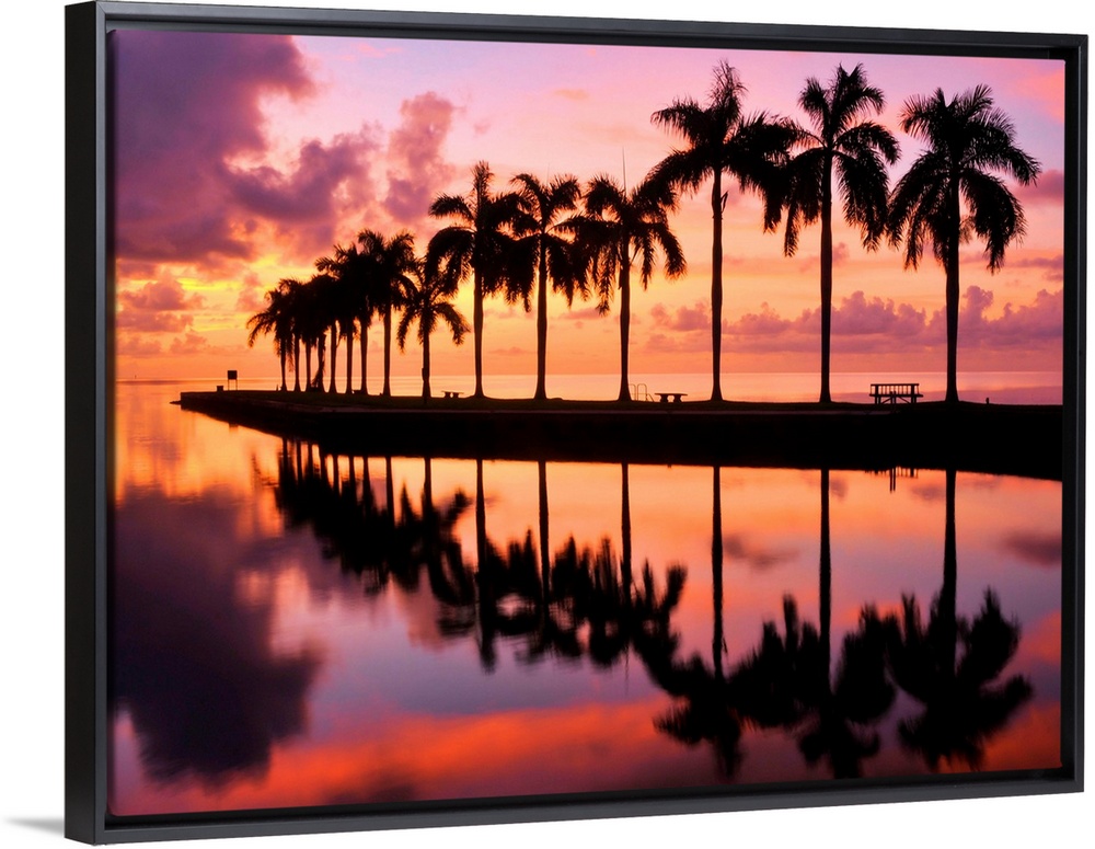 <p>Line of silhouetted palm trees reflected in still water in Florida.</p>