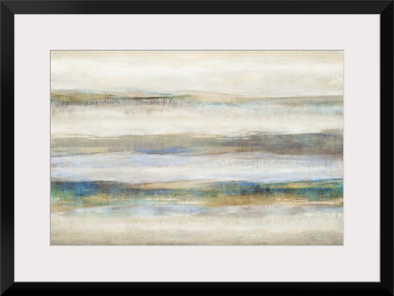 <p>Large abstract painting with neutral colors and pops of blue and gold running horizontally across the canvas.</p>