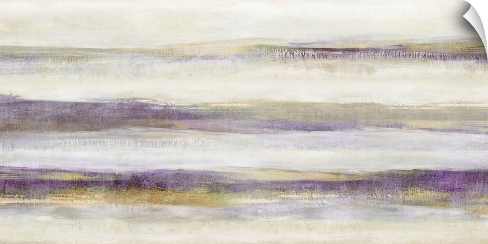 <p>Large abstract painting with bands of gold and purple running horizontally across the white and tan canvas.</p>