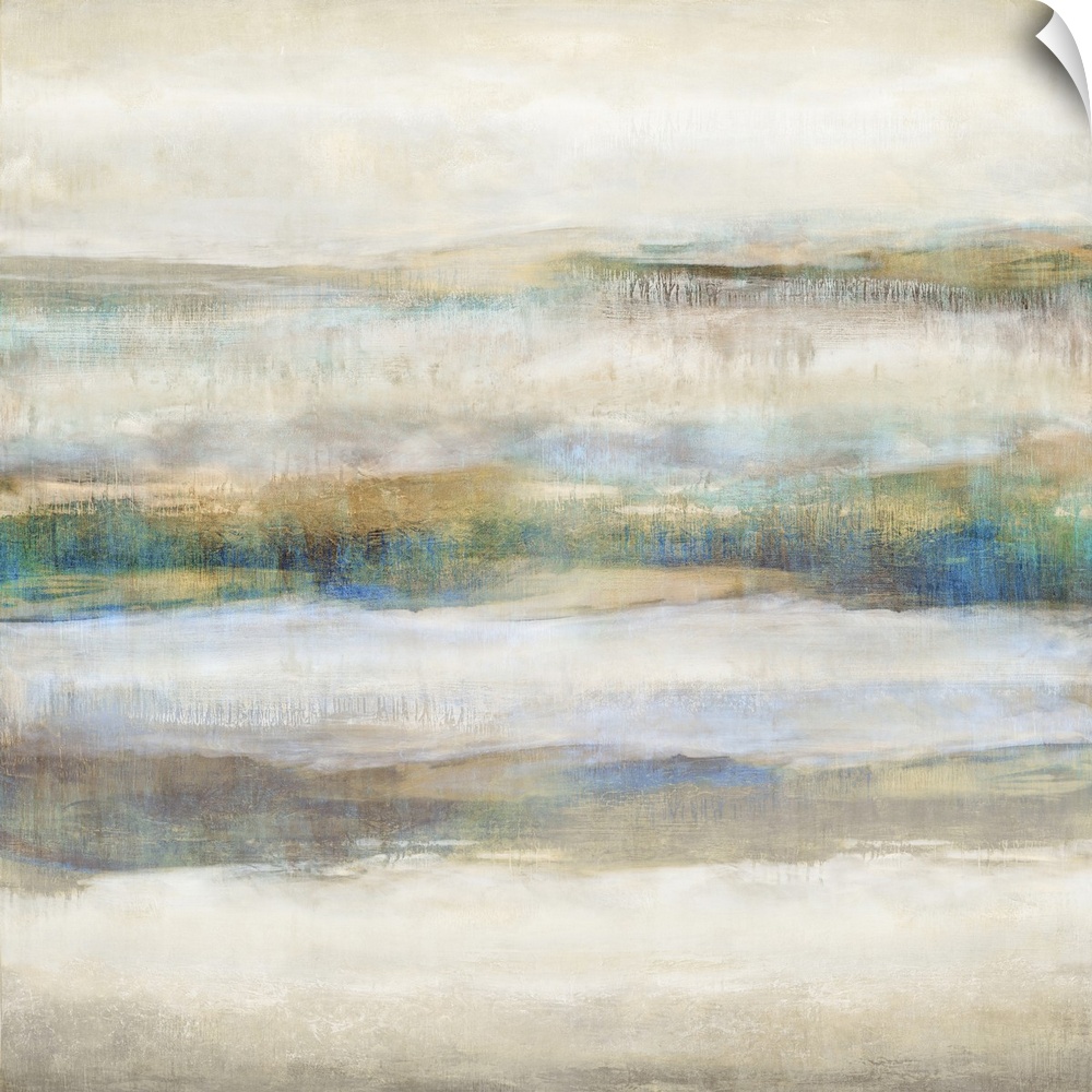 <p>Square abstract painting with neutral colors and pops of blue and gold running horizontally across the canvas.</p>
