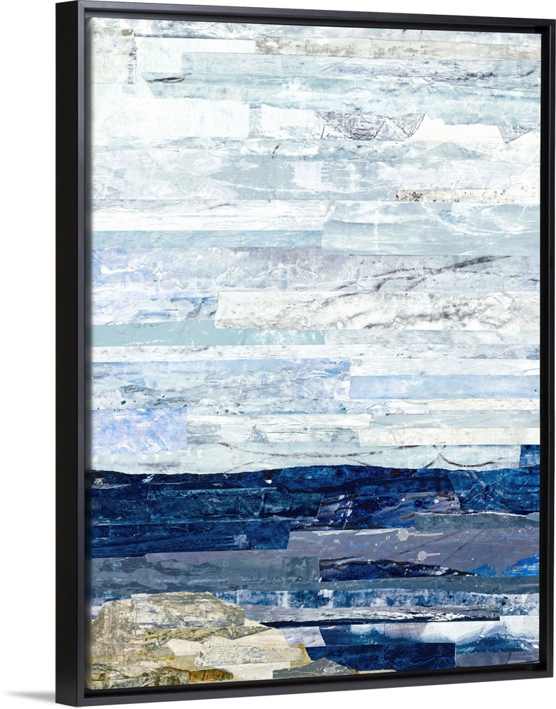<p>Abstract art with strips of color pasted together to create a landscape with deep blue water, a neutral colored cliff, and a light blue sky.</p>