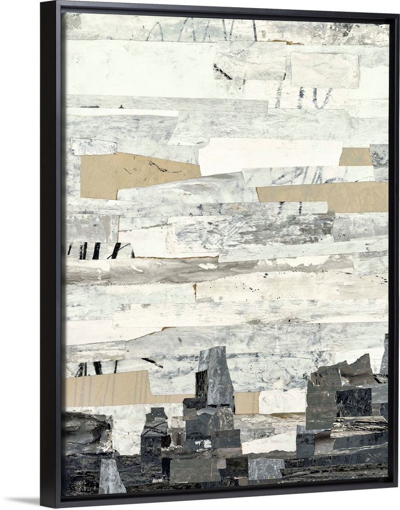 <p>Abstract art with strips of neutral colors pasted together to create a rocky landscape.</p>