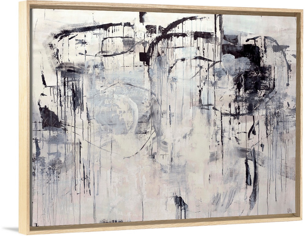 <p>Large abstract art uses lots of vertical and curved lines to elicit movement in the piece. Artist uses short brush strokes and has the appearance of paint running down canvas in certain spaces.</p>