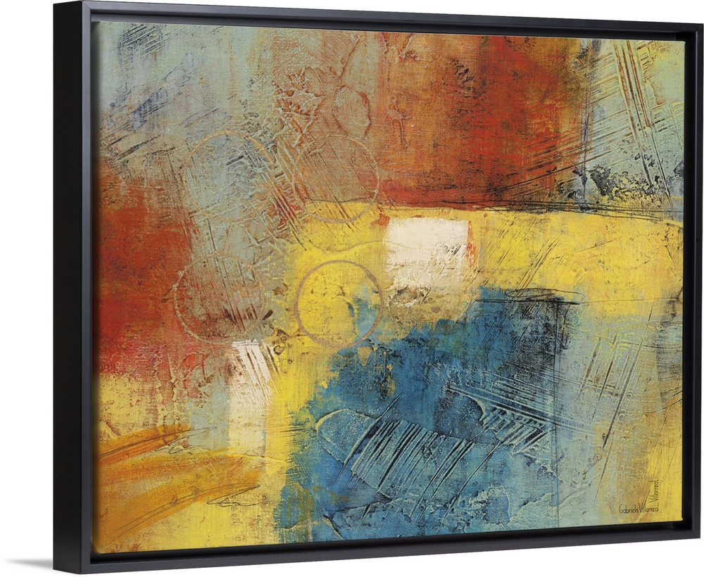 <p>Contemporary abstract artwork using warm and cool tones thrown together in a mix of color.</p>