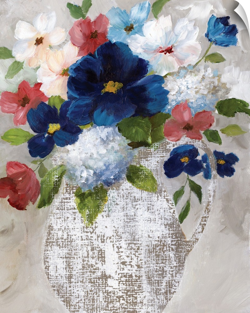 <p>Contemporary painting of a white linen textured vase filled with flowers of red, white and blue.</p>