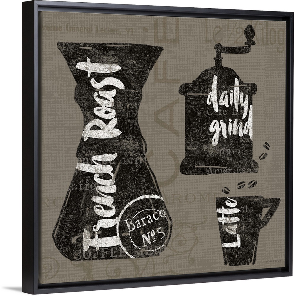 <p>Coffee grinder and mug design with handlettered text.</p>