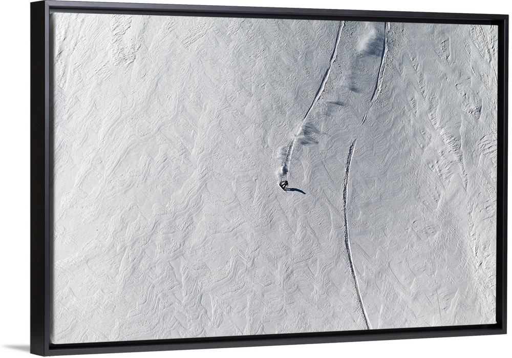 <p>Aerial view of a snowboarder cruising down a snowy mountain.</p>