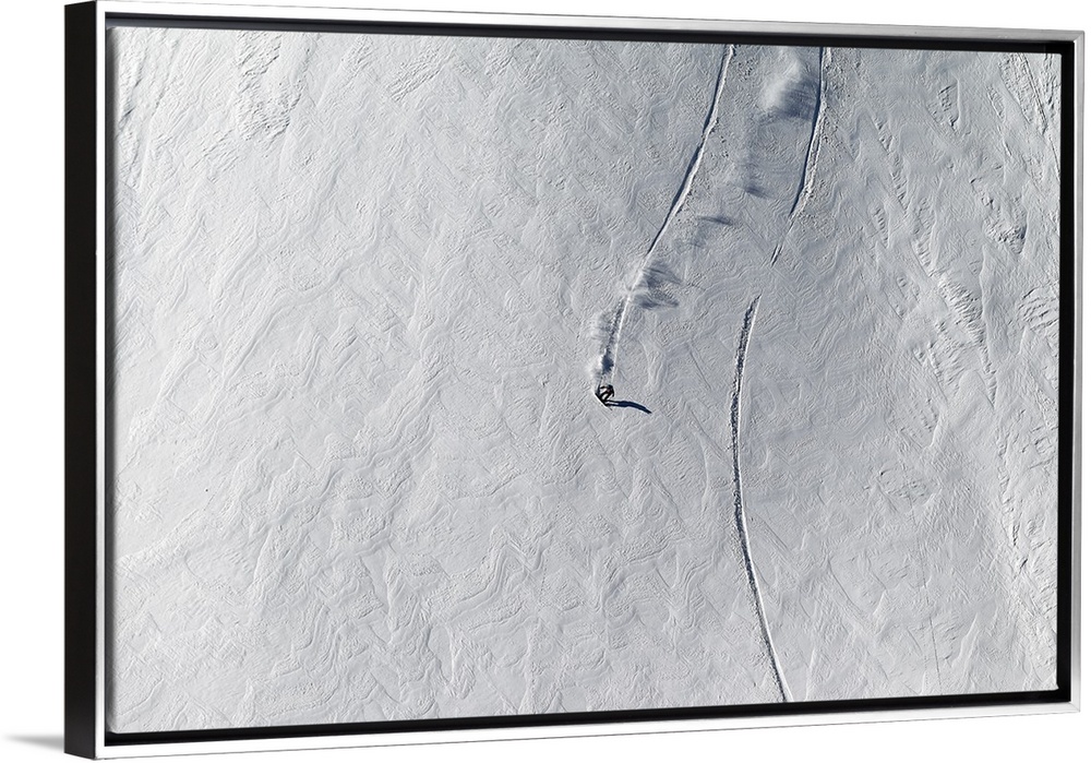 <p>Aerial view of a snowboarder cruising down a snowy mountain.</p>
