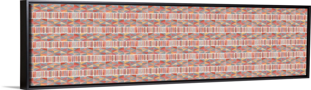 <p>Large panoramic abstract watercolor painting with geometric patterns in shades of red, orange, and grey.</p>