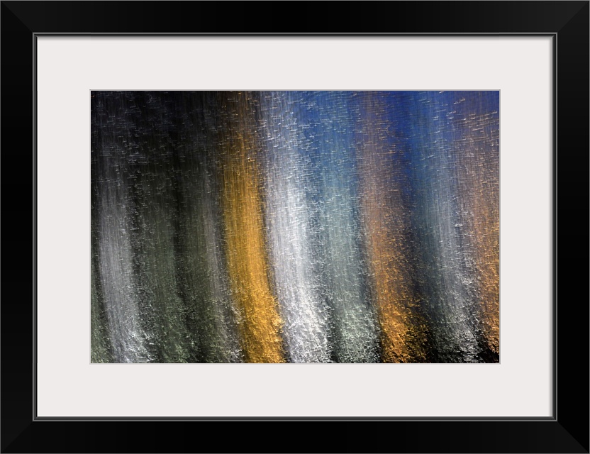 <p>Fine art photograph of silver, gold, and white reflections of light on water in vertical lines.</p>