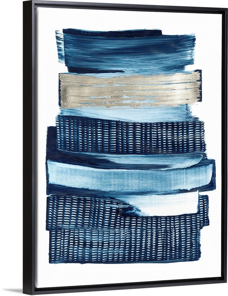 <p>A contemporary painting in shades of deep indigo denim blue with accents of a metallic champagne color. The stacked shapes resemble a pile of folded jeans or towels.</p>
