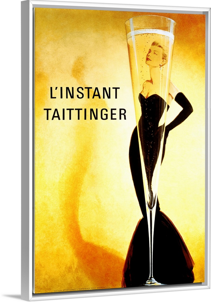 <p>Big print of a slender champagne filled glass with a woman posing seen through it.</p>