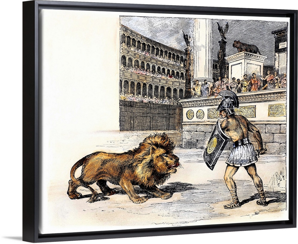 <p>Lion and Gladiator. Contest Between A Lion And A Condemned Criminal In the Arena In Ancient Rome. Line Engraving, American, 1892.</p>