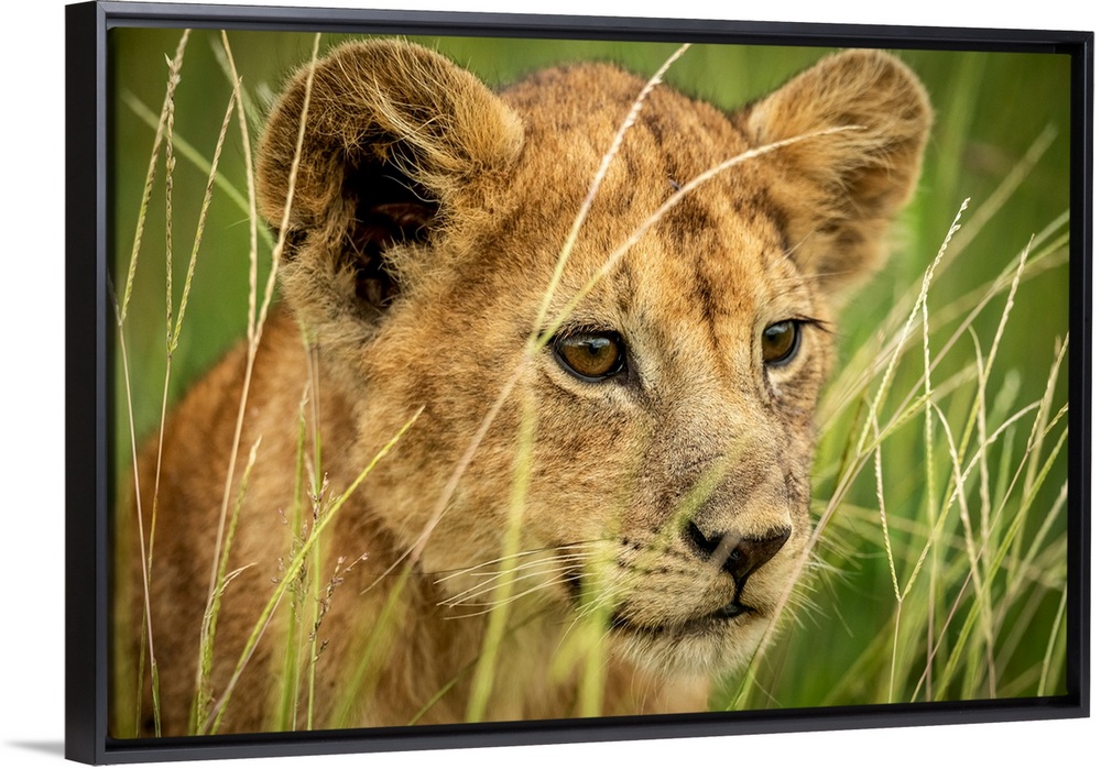 <p>Close-up of lion cub (panthera leo) looking through grass, Grumeti Serengeti tented camp, Serengeti national park, Tanzania.</p>