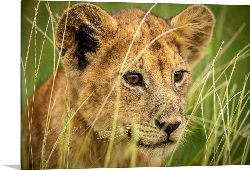 <p>Close-up of lion cub (panthera leo) looking through grass, Grumeti Serengeti tented camp, Serengeti national park, Tanzania.</p>