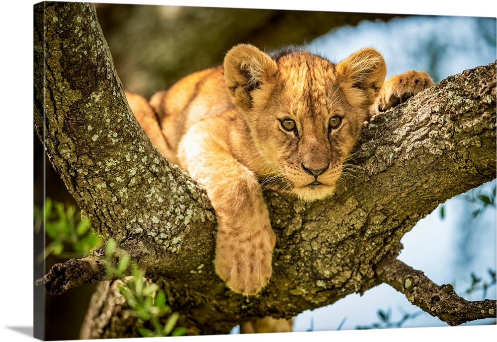 <p>Lion cub (panthera leo) looks out from lichen-covered branch, Grumeti Serengeti tented camp, Serengeti national park, Tanzania.</p>