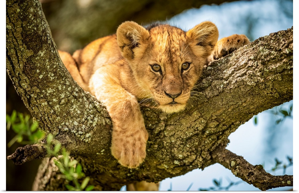 <p>Lion cub (panthera leo) looks out from lichen-covered branch, Grumeti Serengeti tented camp, Serengeti national park, Tanzania.</p>