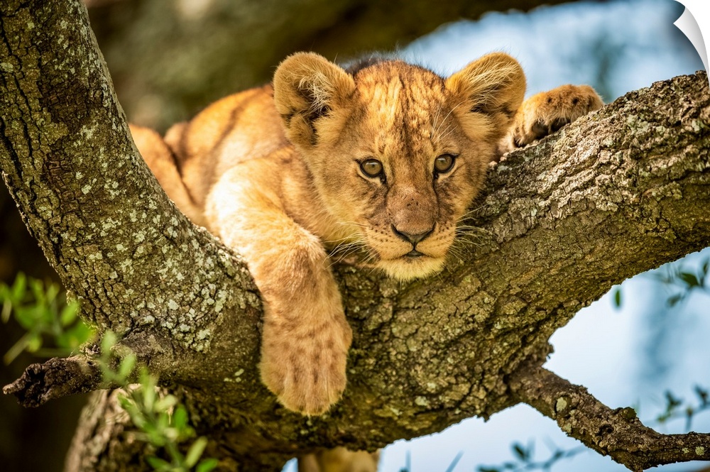 <p>Lion cub (panthera leo) looks out from lichen-covered branch, Grumeti Serengeti tented camp, Serengeti national park, Tanzania.</p>