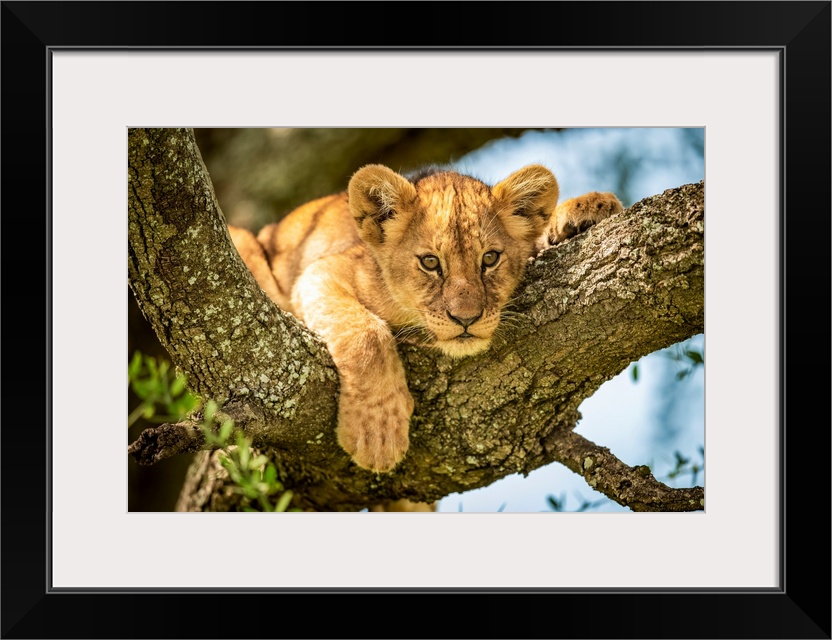 <p>Lion cub (panthera leo) looks out from lichen-covered branch, Grumeti Serengeti tented camp, Serengeti national park, Tanzania.</p>