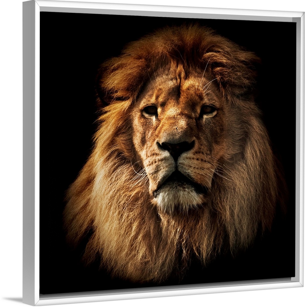 <p>Lion portrait on black background. Big adult lion with rich mane.</p>