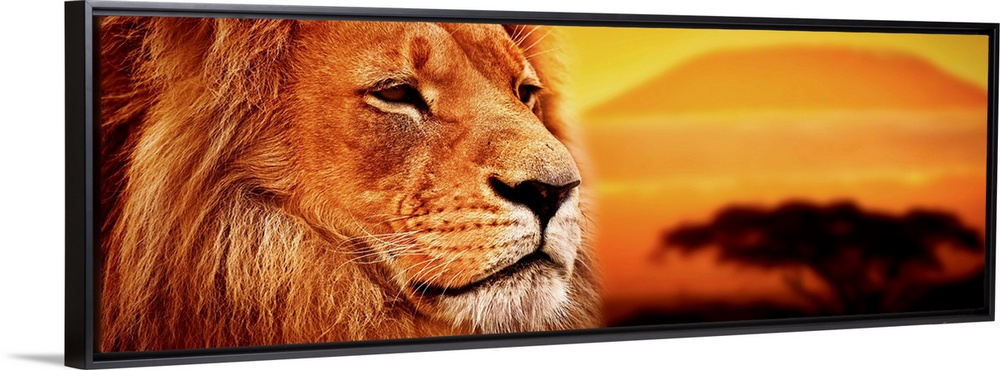<p>Lion portrait on savanna landscape background and Mount Kilimanjaro at sunset.</p>
