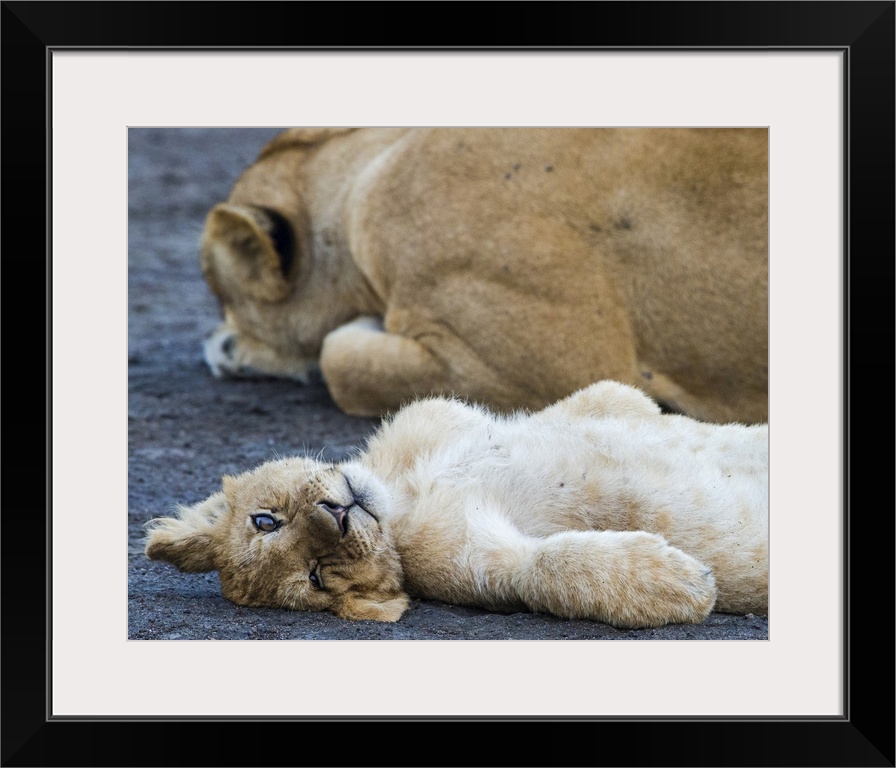 <p>Lion (Panthera leo) with cub relaxing, Ngorongoro Conservation Area, Tanzania, Africa</p>