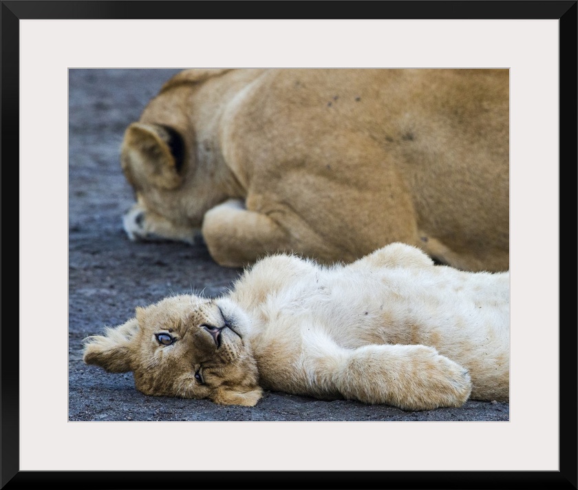 <p>Lion (Panthera leo) with cub relaxing, Ngorongoro Conservation Area, Tanzania, Africa</p>