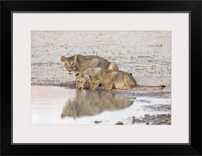 <p>Lioness and cubs (Panthera leo) at water, Kgalagadi Transfrontier Park, South Africa, Africa.</p>