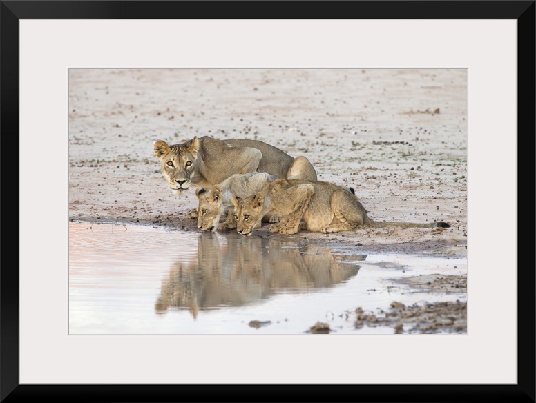 <p>Lioness and cubs (Panthera leo) at water, Kgalagadi Transfrontier Park, South Africa, Africa.</p>