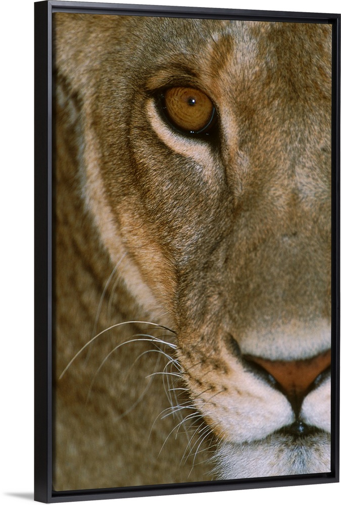 <p>A female lion's face showing her nose, mouth, eye, and whiskers. She is staring intensely, giving the impression of being dangerously close.</p>