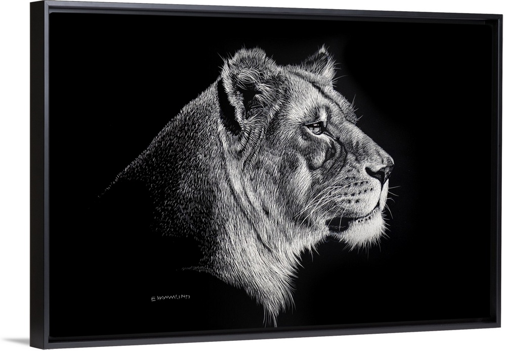 <p>The power of this scratchboard is the beautiful eye of this Lioness. She is staring at her cubs and this piece shows the simple layers of hair that cover her powerful neck and head.</p>