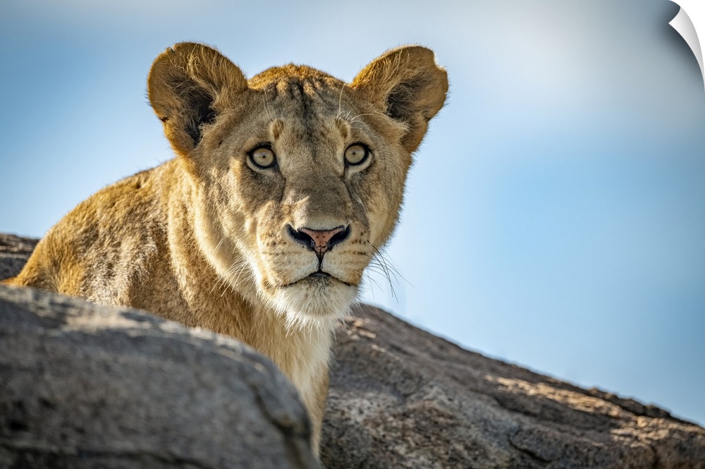<p>Lioness (Panthera leo) sits looking out over rocky boulders, Klein's Camp, Serengeti National Park; Tanzania</p>
