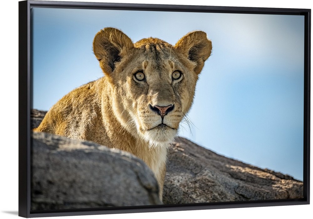 <p>Lioness (Panthera leo) sits looking out over rocky boulders, Klein's Camp, Serengeti National Park; Tanzania</p>
