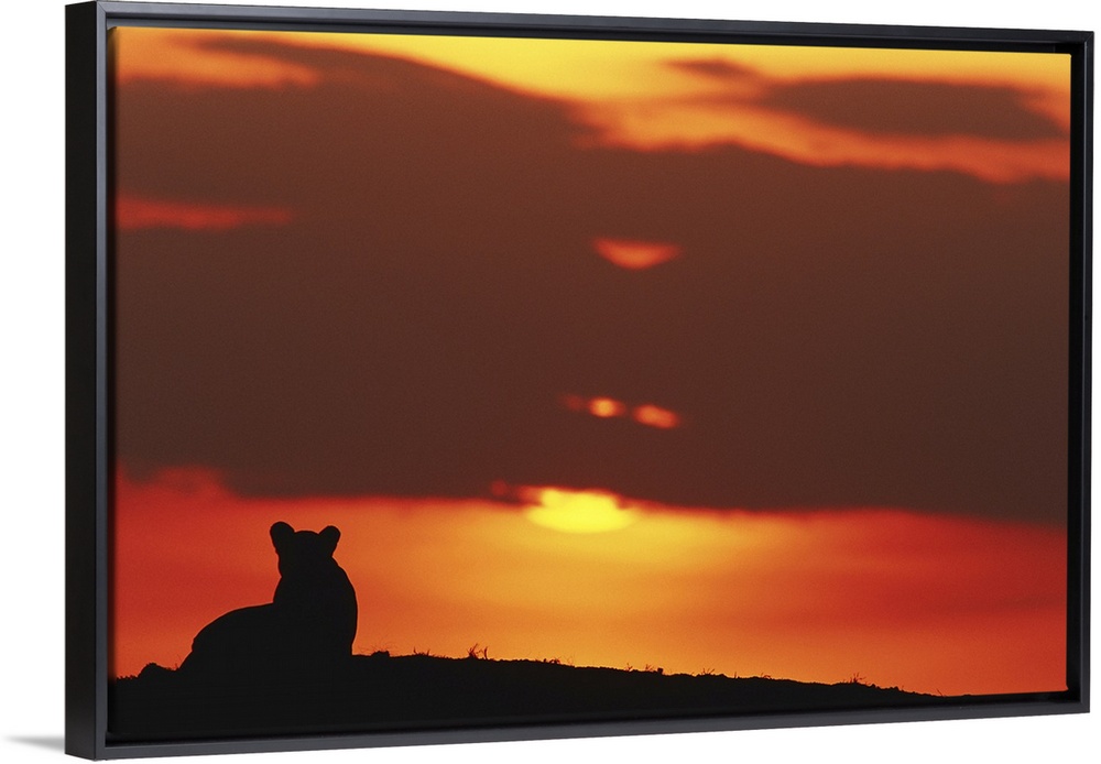 <p>Lioness (Panthera leo) sitting, at sunset, Masai Mara, Kenya</p>