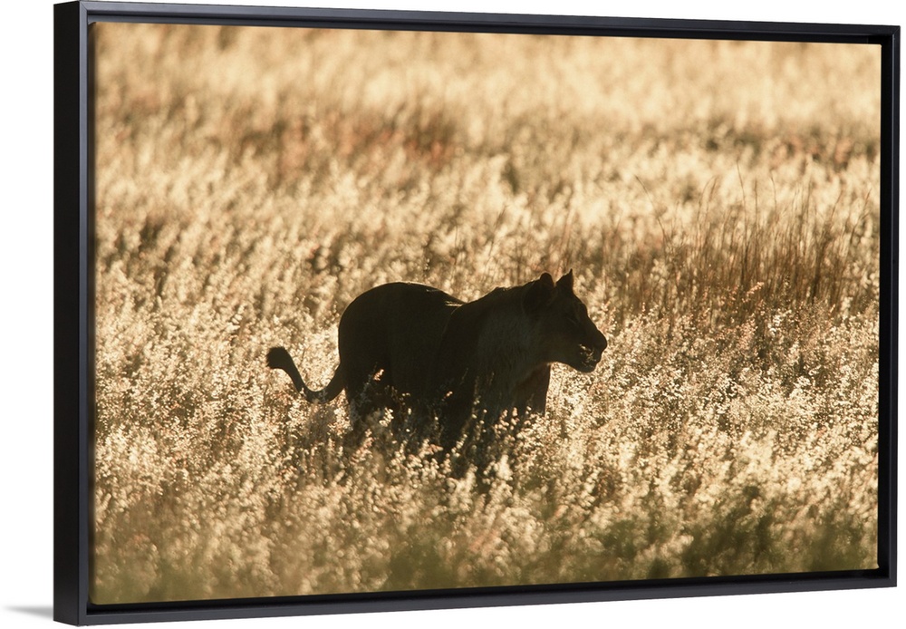 <p>Lioness (Panthera leo) silhouetted in long grass at dusk. Welgevonden Private Reserve, Limpopo Province, South Africa.</p>