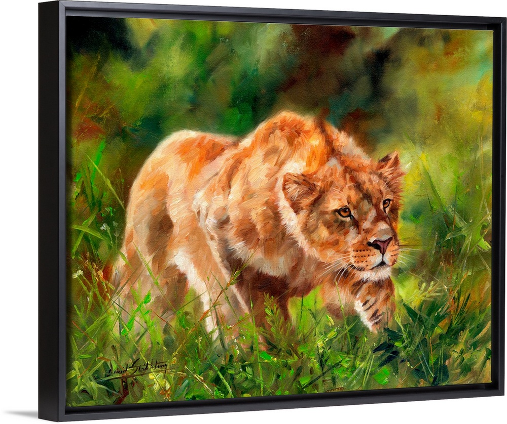 <p>Lioness stalking in verdant undergrowth.</p>