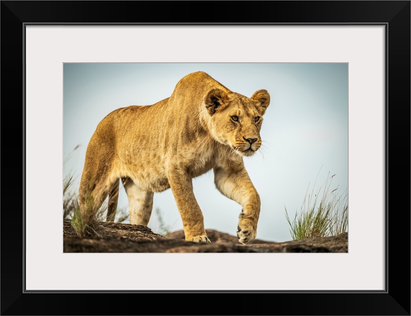 <p>Lioness (panthera leo) walks on rock under blue sky, cottar's 1920s safari camp, Maasai mara national reserve, Kenya.</p>