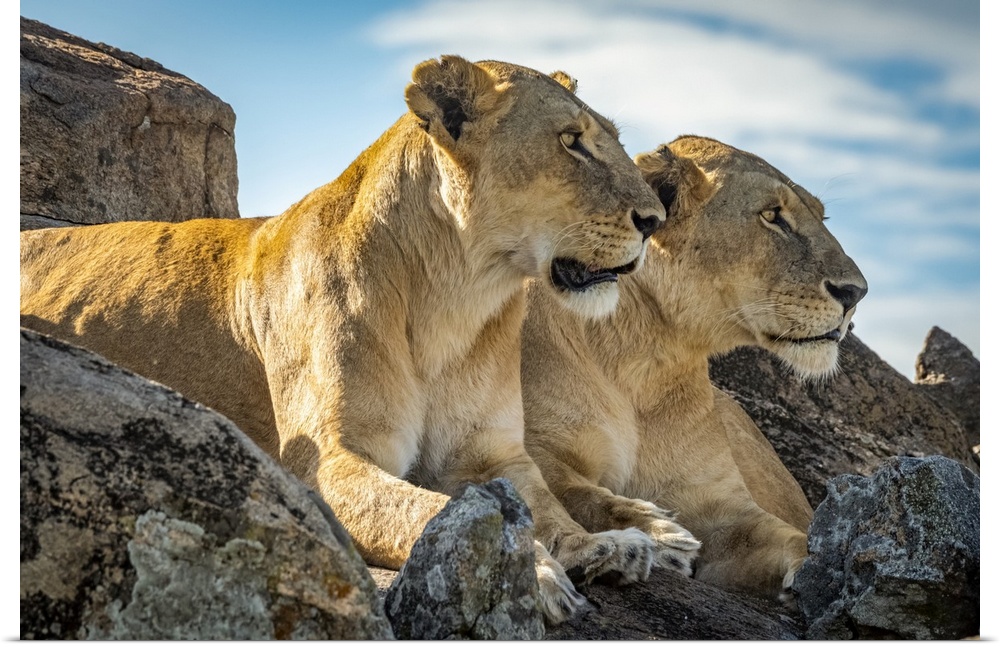 <p>Lionesses (Panthera leo) lie mirroring each other on rock, Cottar's1920s Safari Camp, Maasai Mara National Reserve; Kenya</p>