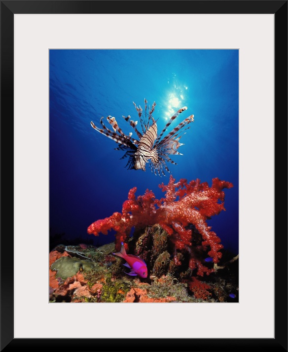 <p>Underwater photograph looking up from the bottom towards the sun reflecting off of the surface and a giant Lionfish swims above a coral pod with soft corals growing from the top.</p>