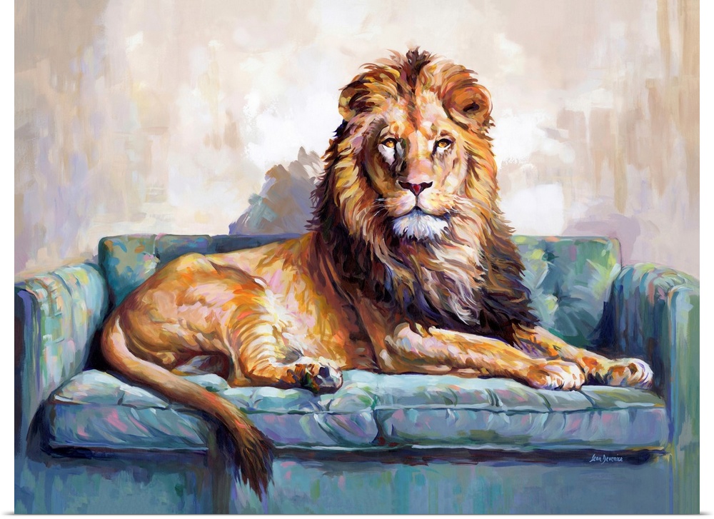 <p>A lion lounges confidently on a teal couch, his calm stare radiating quiet strength and authority. The contrast between wild majesty and domestic comfort creates a surreal, charismatic scene full of personality. This contemporary animal portrait adds bold character and wit to modern spaces.</p>